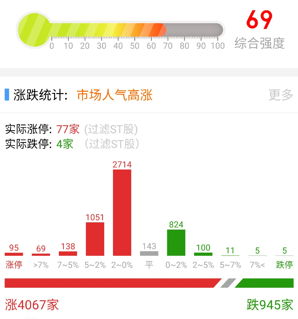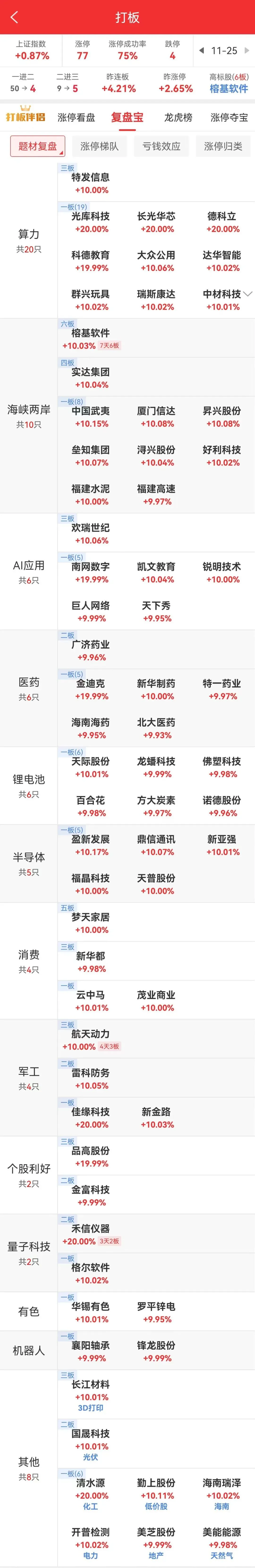大盘定位 三大指数震荡走强后小幅回落,收盘两市总成交超1.8万亿,相较前一交易日放量5%,上涨个股超4000家。市场延续普涨,题材全天快速轮动。其中科技线轮动走强,人工智能(谷硬件端权重中际旭创等强势震荡,沪电股歌)份等涨停,20cm光库科技涨停创新高;应用端实达集团四连板,新华都大单一字三连板榕基软件反包七天六板。 此外海峡两岸福建高速、福建水泥等相继涨停,海峡创新翻红大涨。锂电池板块国晟科技二连板,天际股份涨停,大中矿业水下翻红。 另有芯片概念福晶科技等涨停,商业航天航天动力回封四天三板医药板块、军工板块、海南板块等轮动。 短线情绪修复,高位股中水渔业跌停,但有前期人气股合富中国等深水翻红,断板股榕基软件大长腿反包涨停,负反馈大幅改善。 操作及计划 长江材料三连板了,错过几个亿! 今天海南、福建板块大涨,中国武夷涨停、厦门信达等纷纷涨停,我想打板的昇兴股份没有机会上车。手中的三木集团开盘后一度大跌8个点,随后慢慢拉升一度翻红,惊喜不足,继续拿着,期待明天更大的反弹,反正只有一成仓位。 航天军工板块也很强,尾盘买了个航天长峰,这个股票昨天涨停,龙虎榜有近8千万资金进场,今天跳空高开,缺口不补,视为强,所以我进场博一把。 今天虽然大涨,但要注意到本周三也就是明天是股指期权交割日,周五是股指期货交割日,要注意风险。 目前持有股票如下,总仓位3成,起始资金10万,目前总资产80.3 万,总收益703%。 ============================= 盘中实时接收操作消息的服务号:【炒家生活】 敢同步发送实战操作的,不说全网唯一,至少全网罕见!