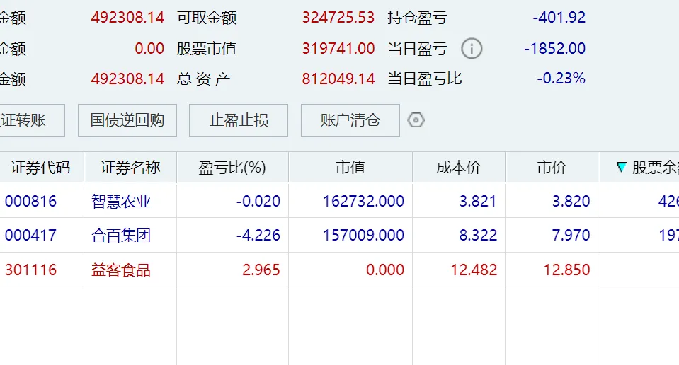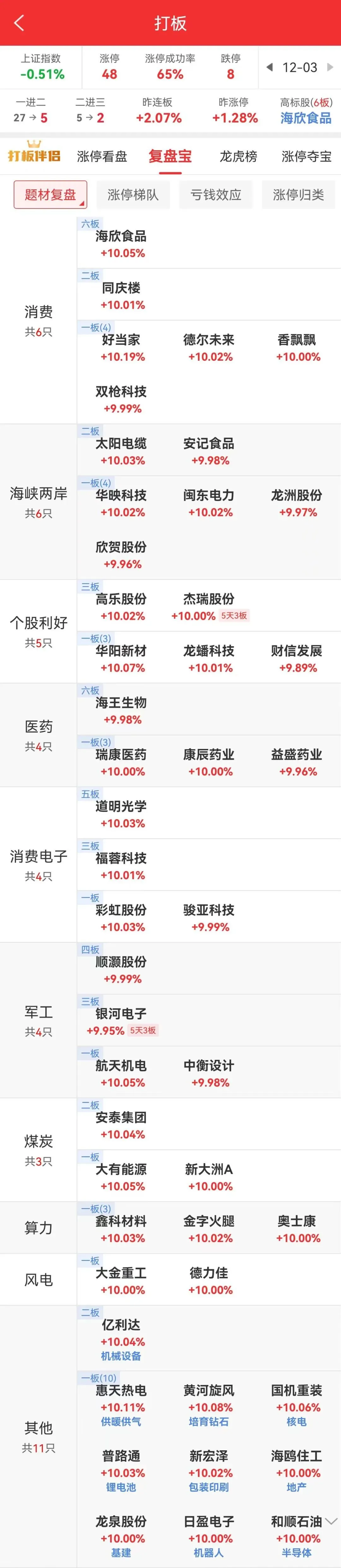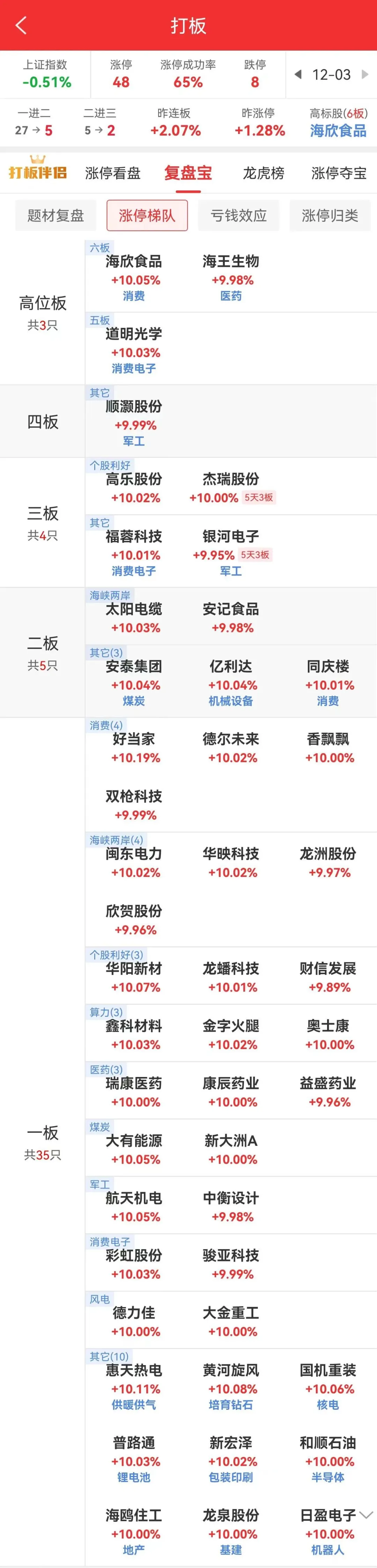 大盘定位 三大指数全天震荡走弱,收盘两市总成交超1.6万亿,相较前一交易放量5%,下跌个股超3600家。 市场延续普跌,题材多股分化走弱。其中海峡两岸太阳电缆二连板,龙洲股份午后涨停,但有平潭发展跌停,海峡创新大跌超-15%。 商业航天顺灏股份四连板,银河电子四天三板,但有航天动力、招标股份等多股炸板。 盘中题材弱势轮动,医药板块海王生物六连板,20cm金迪克、粤万年青大涨。大消费海欣食品六连板,安记食品二连板。 另有海南板块、金刚石概念、煤炭板块等小幅轮动,但多数冲高回落,收盘炸板率近35%。 短线情绪弱势,高位股梦天家居等跌停,平潭发展触及跌停,连板金富科技天地板,整体负反馈明显。 操作及计划 昨天没买到的海鸥住工,今天继续涨停,但我没打了。因为今天情绪太差。 昨天没有上板的欣贺股份今天上板了,今天盘面感觉不太好,就放弃了。 昨天惠发食品和安记食品,两个我直接相中安记而不是惠发,有人问为什么,没有原因,就是审美的感觉,今天的走势也证明了我的眼光是准的。 益客食品拿了多天,今天终于冲了一把,吃肉4个点走人。 今天准备打的回封板,只有合百集团上车了,这个票上车我就有点后悔,因为这个票近几次都是炸板的,炸板率有点高,果然尾盘还是炸了,日面一大碗,把利润都吐完了。 智慧农业强势整理,继续拿着。 今天行情不好,个股普跌,又是临近年底,继续控制仓位在四成。 目前持有股票如下,总仓位4成,起始资金10万,目前总资产81.2 万,总收益712%。 盘中实时接收操作消息的服务号:【炒家生活】 敢同步发送实战操作的,不说全网唯一,至少全网罕见! 凡是点赞+“在看”的,都吃到涨停板了↓↓↓