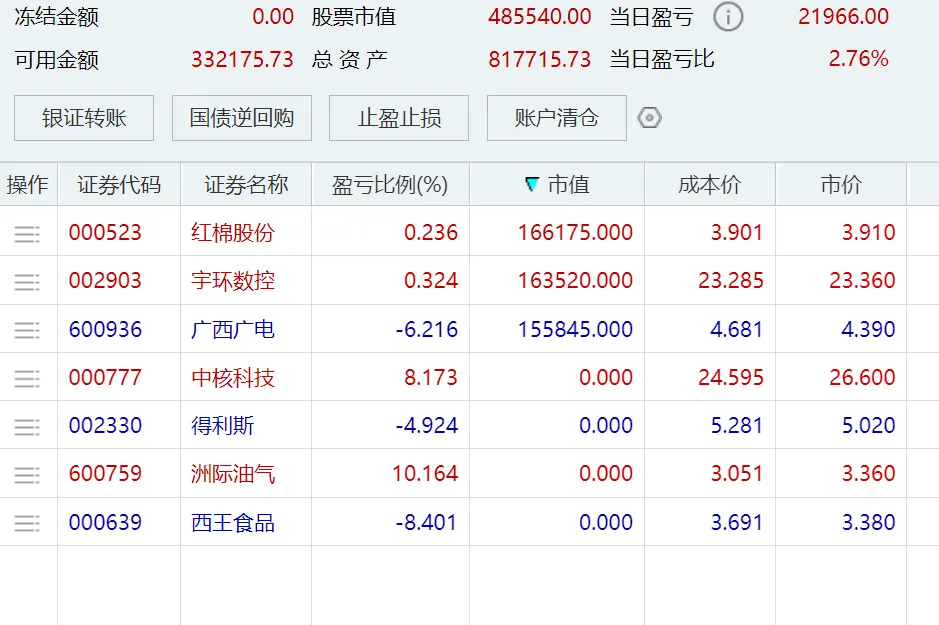 周五打板的三个票,广西广电当天炸板,今天走弱,但看它有机器人概念的面子上,继续拿着。