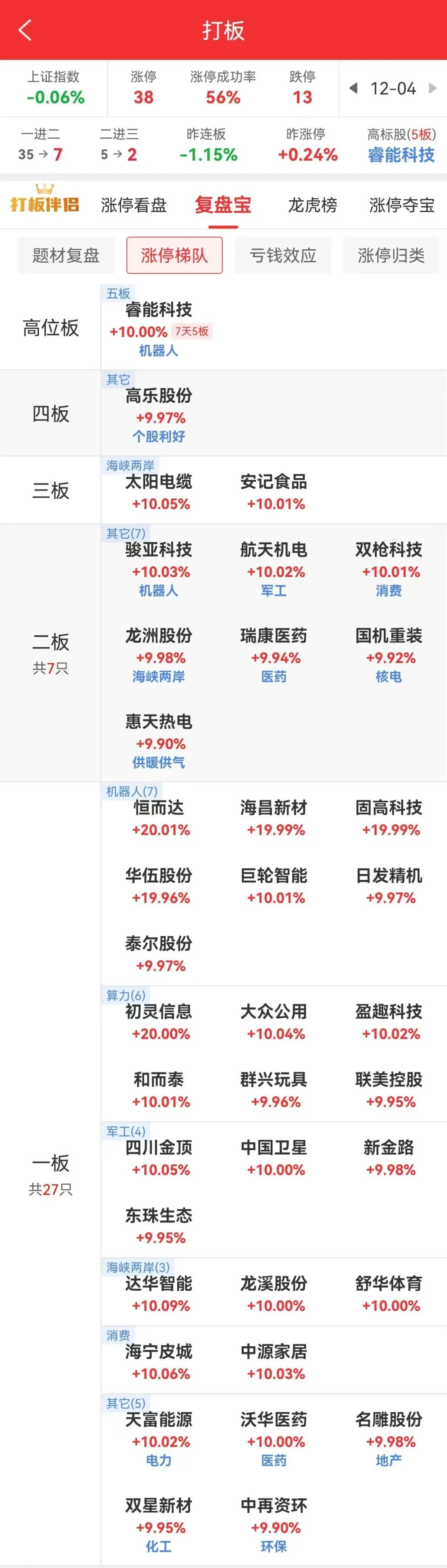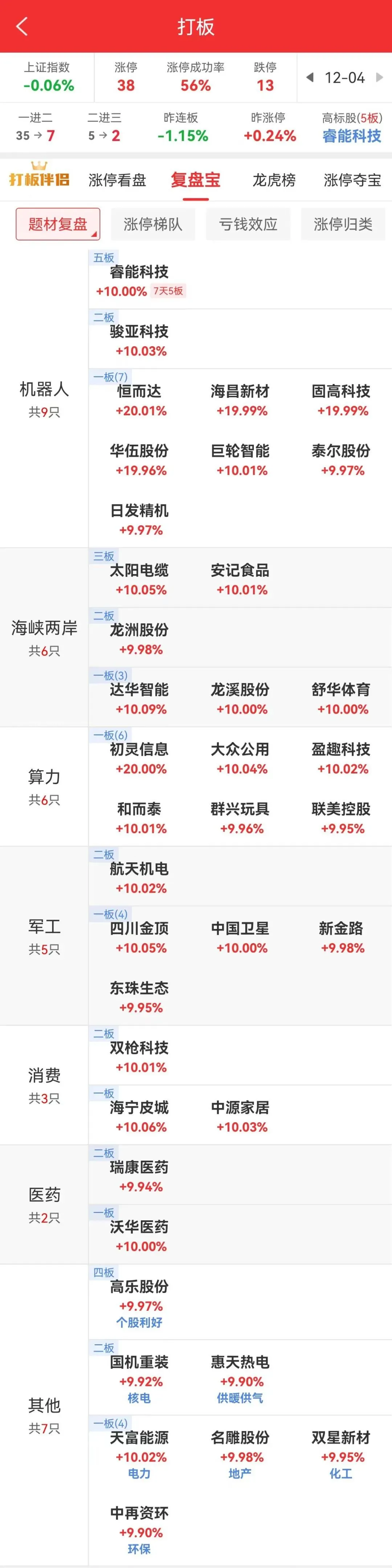 大盘定位 三大指数下探回升,创业板指涨超1%,收盘两市总成交不足1.6万亿,相较前一交易缩量7%,下跌个股超3500家。市场全天弱势轮动,题材整体强度一般。 机器人概念相对强势,其中睿能科技回封六天五板,巨轮智能盘中直线涨停,权重三花智控冲板回落。 商业航天航天机电五天三板,中国卫星午后涨停,航天发展炸板,20cm招标股份等全天高位震荡。 此外海峡两岸(福建)太阳电缆一字三连板,摩尔线程概念初灵信息等相继涨停,另有有色金属、医药、大金融等轮动但多股冲高回落,收盘炸板率超40%。短线情绪弱势,连板道明光学、海欣食品等超10家个股跌停,另有日盈电子等超10家个股全天大幅回落,负反馈无明显改善。 操作及计划 今天没有操作。 智慧农业早上冲高4个点没走,因为仓位比较轻,就相对佛系了,所以继续拿着。 有卖出的,也是对的。现在看来还是落袋为安好,有点后悔。 今天行情不好,个股继续普跌,又是临近年底,继续控制仓位。 目前持有股票如下,总仓位2成,起始资金10万,目前总资产81.1 万,总收益711%。 盘中实时接收操作消息的服务号:【炒家生活】 敢同步发送实战操作的,不说全网唯一,至少全网罕见! 凡是点赞+“在看”的,都吃到涨停板了↓↓↓