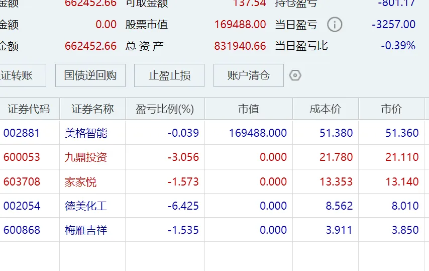 开盘后高位股以航天工程为代表的大批股票开始跳水,预示着短线情绪转弱,所以我也赶紧卖卖卖,快速卖出家家悦、德美化工、九鼎投资等票,下午进一步卖出梅雁吉祥,仓位直接从100%降到20%,只留了一个AI板块的美格智能。